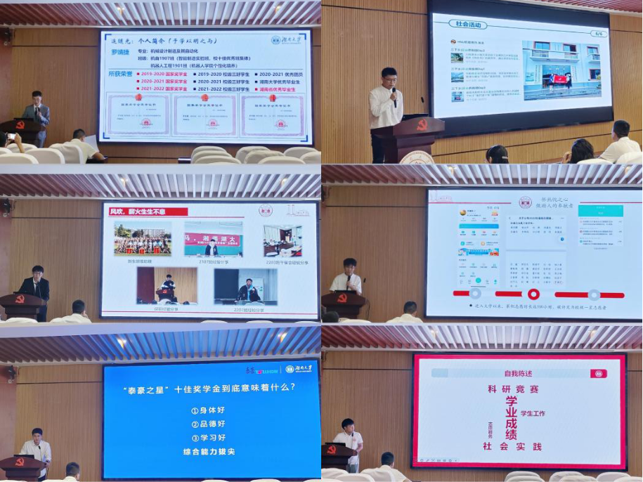 答辩环节正式开始,十二位本科生和八位研究生们相继上台答辩,每一位辩手都激情满怀,意气风发的演讲感染了台下众人。他们从学习、科研、学生工作、生活作风等方面展示自己的风采,将机械院的良好的生活作风、优秀的学习氛围体现的淋漓尽致。在每一组答辩过后,选手都积极回答评委老师提出的问题,最后由李迪老师作出总结。