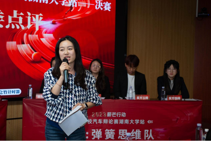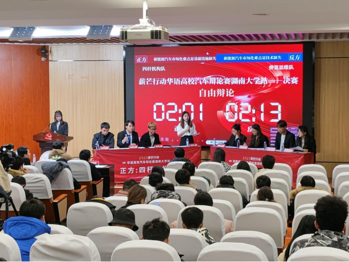 辩论赛进行时,正反双方结合当今社会现状,就新能源汽车市场化的难点展开了激烈的辩论。正方辩手从基础设施缺乏角度进行阐述,就充电桩的数量少与利用率低的问题展开论述。反方则从技术不足方面抒发观点,就新能源汽车技术不足与技术难突破问题展开论述。在本环节中,双方辩手引经据典、巧妙论述,充分展现了扎实的学术素养和辩论技巧,赢得了观众的掌声和赞赏。在随后的观众提问环节中,同学们更是踊跃参与,就辩题与辩手们进行了友好的讨论和交流,表达了自己的观点和见解。