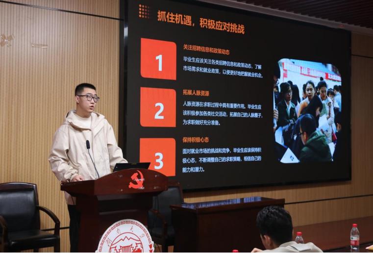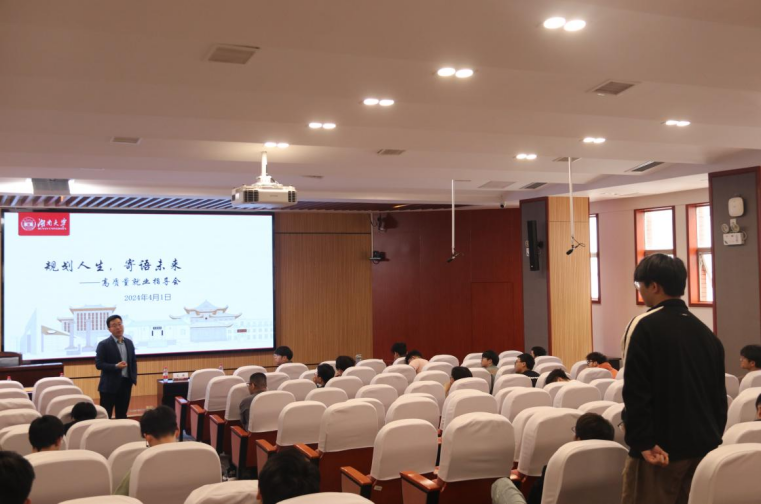 4月1日下午,350vip葡京新集团在院楼401报告厅对大四即将毕业的学子们开展了促进高质量就业指导会。350vip葡京新集团党委副书记刘明然、本科生辅导员叶胜参加本次指导会,活动邀请了往届和应届优秀就业典型代表进行分享,本科生辅导员迪里胡玛主持会议。