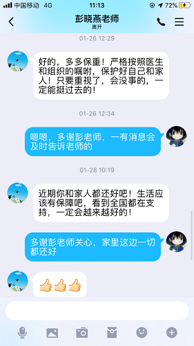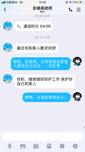 2020年1月20下午,钟南山院士证实了新型冠状病毒肺炎的“人传人”现象。在得知疫情的严重性之后,彭晓燕老师第一时间给她的学生们通了电话,询问了他们的身体健康情况和家人的健康情况,并鼓励他们不用过多担心,保持良好的心态,做好自身和家人的防护工作。彭晓燕老师也多次通过线上聊天等方式向学生予以关心。