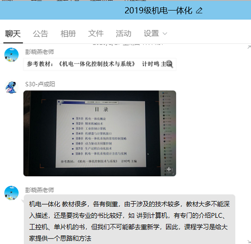 正式线上教学后,彭晓燕老师会在每次课程伊始,询问每一名学生及其家人的身体状况以及生活上是否有困难,老师的讲话声音是否清楚,PPT翻页是否流畅等信息,经确认后才正式开始讲课。彭晓燕老师采用实际案例型教学形式,以她之前的工程项目为实例,从“点线面”的角度出发,将涉及到机电一体化控制领域的部分由浅入深、层层递进的进行剖析。对于学生们反馈的问题与疑惑,通过摄像头、视频演示、直播屏幕等方式进行一一解答,让学生们隔着屏幕也能感受到类似面授的学习体验。