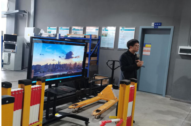 首先参观的是HWF50激光3D制造系统,该系统主要用于普通碳钢板、不锈钢板等材料的切割、焊接以及零件的激光增材制造,参观时正在进行激光切割复杂三维工件和激光增材制造大型件的研究工作。
