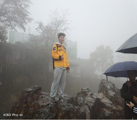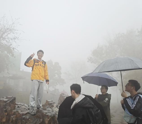 本次活动的领队是登山经验丰富的徐万青同学,精力充沛的他带着10班健儿们越过一层又一层台阶,此时的他就像探险家徐霞客,熟悉每一个路段,迈着稳健的步伐带着同学们向山顶冲击。登山路上虽有寒风细雨,但机械10班勠力前行,不畏艰难险阻,只为一览山顶的风景。风雨对于他们而言不是阻碍,只是攀登顶峰途中的一缕点缀。