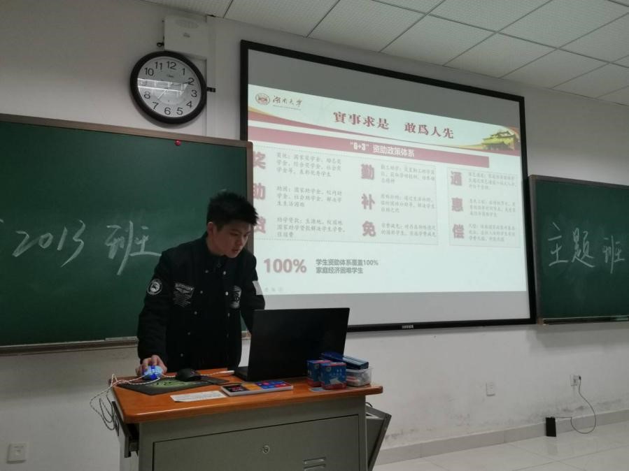 接下来,班长先讲解了我校学生资助政策的具体内容,将“6+3”资助政策体系展示给同学们研读。通过这部分介绍让大家明白了350vip葡京新集团对社会的庄严承诺:不让一名学生因家庭经济困难而失学,让每位学生共同享有人生出彩、梦想成真的机会!