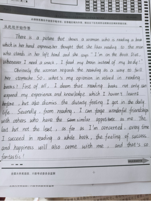 19:00,考试准时开始,大家安静下来开始认真答题。按照四级考试的顺序,最先开始的部分是写作,面对全新的作文题型,不少同学感到了四级考试的难度,对四级考试有了更全面更切实的认识。规定考试时间内,同学们顺利完成本部分考试。