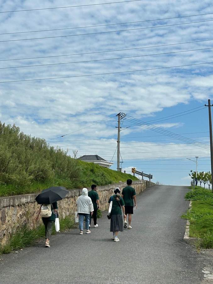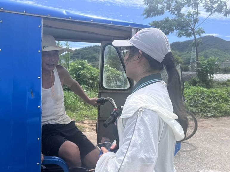 上午,美丽乡村风景如画,草木依然,一路的风景仿佛一首舒缓明亮的民谣,将团队成员们的心慢慢点亮。村民们热情好客,对团队同学们推广普通话的行为十分支持,积极配合。团队同学们在和热情的农民伯伯们的聊天中发现他们大多说方言,能听懂普通话,但与外地人交流略有障碍。在受采访对象中,有一位刚劳作完的农民伯伯表示,曾在学校系统学习过普通话,但由于农产品销售的对象多为当地居民,交流自然以方言为主,所以在时间的流逝中普通话能力逐渐退化。