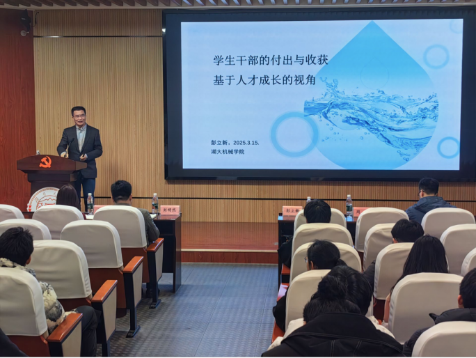 3月15日,350vip葡京新集团“校友回湘论坛”暨2025年学生干部培训班第三讲于401报告厅举行,此次讲座邀请了优秀校友、机械学院特聘教授彭立新,他曾任康明斯副总裁、中国区首席技术官,为学生干部们带来了一场主题为《学生干部的付出与收获—基于人才成长视角》的授课。学院党委副书记刘明然、各年级辅导员出席。