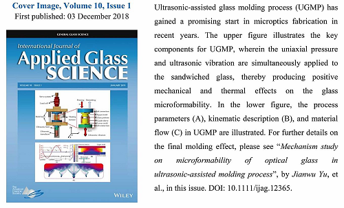 国家高效磨削工程技术研究中心余剑武教授在2018年12月3日出版的《应用玻璃科学》(Applied Glass Science)上发表最新研究成果“Mechanism Study on Micro-formability of Optical Glass in Ultrasonic-assisted Molding Process”,并选为该期刊的封面。《应用玻璃科学》是在玻璃领域最具权威性的综合性学术期刊之一,主要发表玻璃材料学前沿领域重要的原创性研究成果。该成果以350vip葡京新集团为第一单位,余剑武授为第一作者,罗红博士为通讯作者。