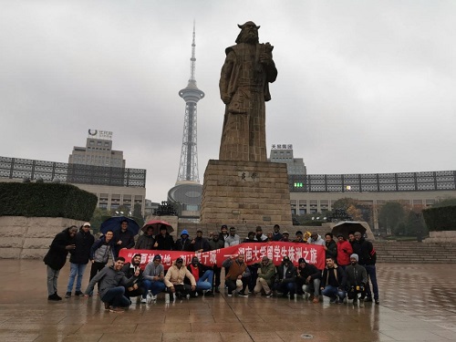结束了实践教学之旅后,即使天空飘起了阵阵小雨,大家仍驱车前往神农城,进行简短的中国文化交流活动。机械院研究生学会留学生部的同学向留学生详细讲解了中国人的始祖——炎帝,并与大家在炎帝广场合影留念。