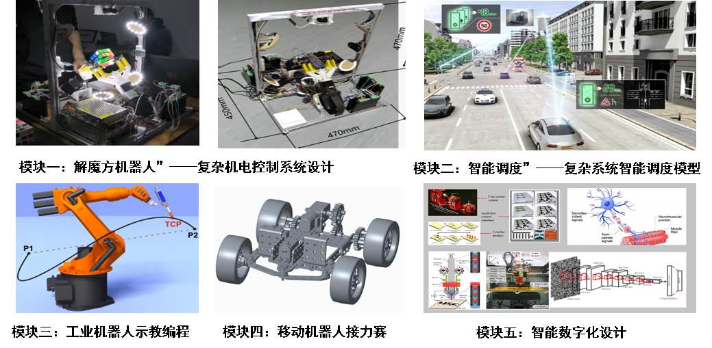 《专业认知实习》根据学院现有的教学及实验资源,分别从机械设计制造及其自动化专业、车辆工程专业、工业工程专业、工程力学专业和能源与动力专业出发,共提供了“解魔方机器人”——复杂机电控制系统设计、“智能调度”——复杂系统智能调度模型、智能数字化设计、机器视觉、工业机器人示教编程等26个实习模块,每个实习模块分别以“理论培训”+“实践训练”的形式开展专业认知实习。