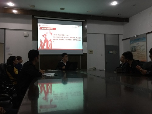 下午四点十分,支部党员及发展对象全部到齐,学习活动正式开始,活动由支部组织委员杨海洋同志主持。杨海洋同志简要介绍此次学习活动的目的及意义,希望支部全体党员及发展对象共同学习、共同探讨,对新修订条例有更加深入地理解。